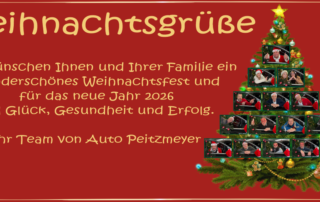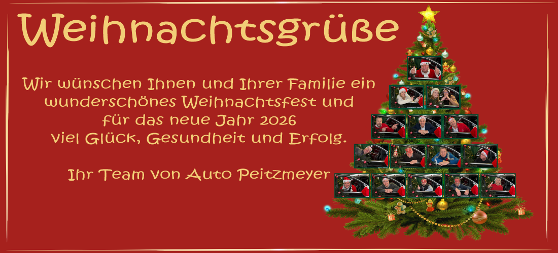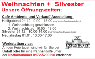 Peitzmeyer_admin_web2025-12-08T12:25:08+01:00Ausstellung: Heiligabend 24.12. 9.00 - 13.00 (nur Verkauf/Ausstellung) 1. Weihnachtstag geschlossen (nur Verkauf/Ausstellung) 2. Weihnachtstag 10.00 - 18.00 (nur Café/Verkauf/Ausstellung) Silvester 31.12. 10.00 - 14.00 (nur Verkauf/Ausstellung) Neujahrstag geschlossen Reparatur-Annahme: Heiligabend geschlossen 1. Weihnachtstag geschlossen 2. Weihnachtstag geschlossen Silvester 31.12. geschlossen Neujahrstag geschlossen Unfall + Pannenhilfe Tag & Nacht: 0172-5209990 - auch an den [...]