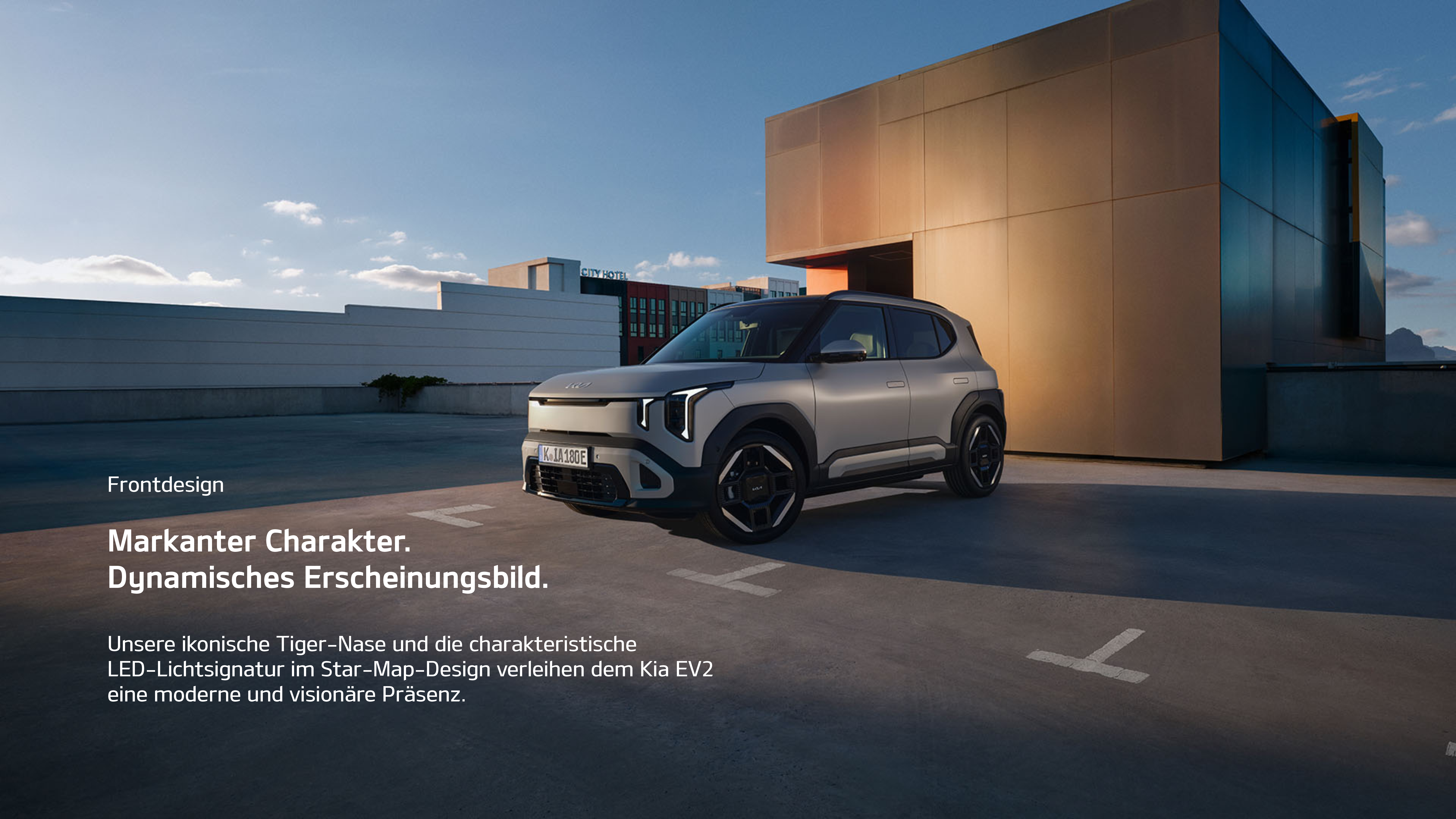 Ein Statement – schon auf den ersten Blick. Kompakt und dennoch selbstbewusst: Der Kia EV2 interpretiert die Eleganz größerer Kia Modelle in einer verfeinerten, agilen Form neu. Fortschrittliche Assistenzsysteme, durchdachter Komfort und eine lebendige Innovationskraft verschmelzen zu einem Erlebnis, das Neugier weckt und grenzenlose Begeisterung verspricht.