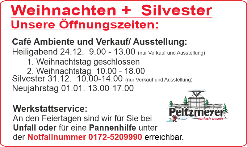 Ausstellung: Heiligabend 24.12. 9.00 - 13.00 (nur Verkauf/Ausstellung) 1. Weihnachtstag geschlossen (nur Verkauf/Ausstellung) 2. Weihnachtstag 10.00 - 18.00 (nur Café/Verkauf/Ausstellung) Silvester[...]